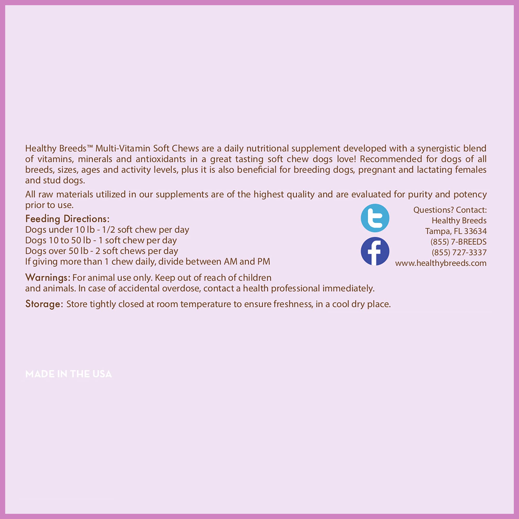 Details: A daily nutritional supplement developed with a synergistic blend of vitamins, minerals and antioxidants in a great tasting soft chew that dogs love! Healthy Breeds Multi-Vitamin Soft Chews are recommended for dogs of all breeds, sizes, ages and activity levels. They are also beneficial for breeding dogs, including pregnant and lactating females and stud dogs.