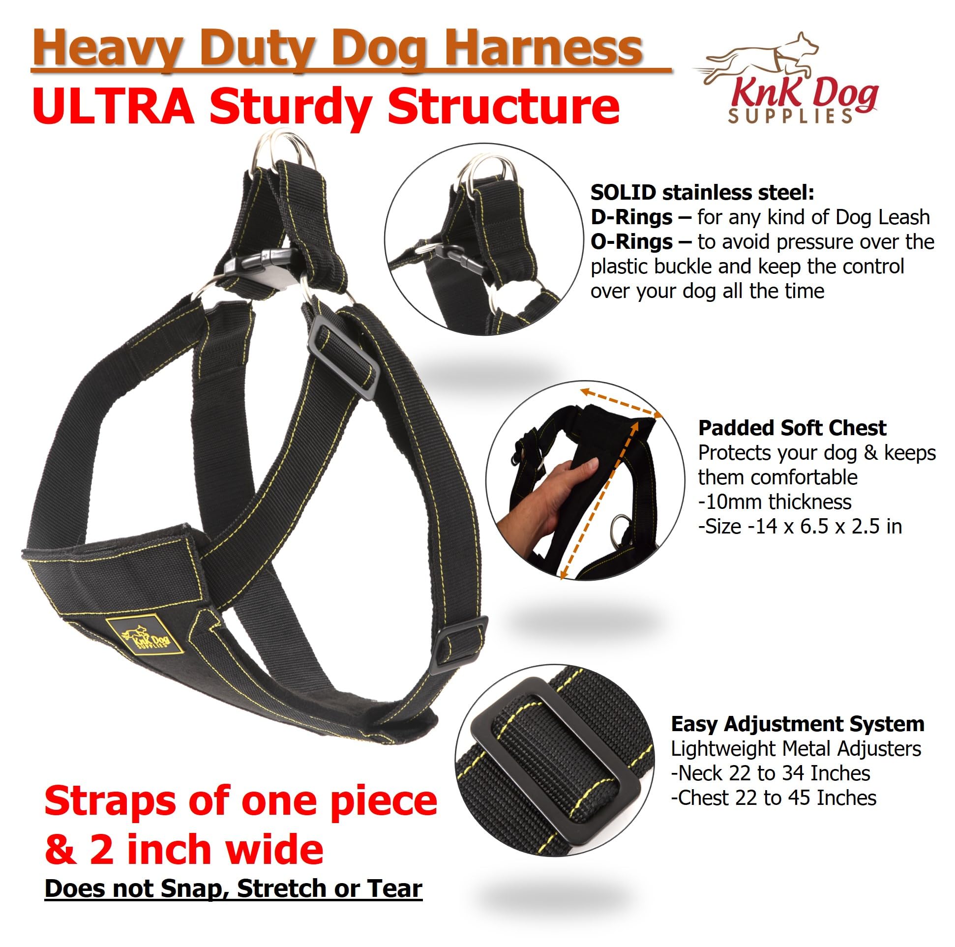 Details: “This special large dog harness was created and tested by our dogs, including Boxers, Belgian Malinois, and Huskies. We can guarantee that it’s fantastic gear for various activities such as walking, running, training, jogging, hiking, and even dog sports like biking and skating. Ensure comfort for your dog with our collars, harnesses & leashes at all times: If your dog tends to pull, you can now safely walk your pet. This dog harness for large dogs is designed to distribute your dog’s weight evenly across the soft and breathable padded chest area, preventing any potential injuries that may occur around the neck when using a collar. Ideal for medium and large dogs: Our harness is fully adjustable with two lightweight metal adjusters, allowing you to achieve the perfect fit for your dog’s body. It’s lightweight yet sturdy, making it easy for your dog to wear. Additionally, it’s easy to clean and effortless to put on and take off thanks to the simple buckle clasp. For detailed sizing information, please refer to the size chart picture. Experience our Happiness Guarantee: At KnK Dog Supplies, your happiness and your dog’s happiness are our main priorities. We are confident that you’ll love the harness, but if for any reason you or your dog are not satisfied, simply let us know, and we will resolve the issue. We’re here to support you and your dog because we genuinely love dogs. Your happiness is guaranteed with our harness. “